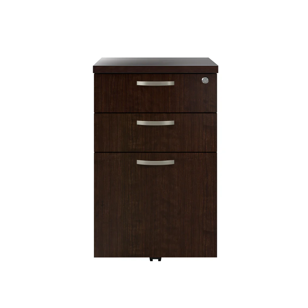 The Bush Business Furniture Easy Office 3 Drawer Mobile File Cabinet offers an ideal solution for adding storage to any professional workplace. With its dual-wheeled casters and finished back, the portable File Cabinet provides convenient access to paperwork and supplies anywhere in your office. A single file drawer organizes letter, legal and A4-size documents while two box drawers store writing utensils, notepads and more. Drawers open on smooth full-extension ball bearing slides for an effortless reach to contents, and the top drawer can be locked to secure valuable items. A compact 16W x 20D x 25H design allows the small filing cabinet to fit underneath coordinating Easy Office Cubicle Desks (sold separately) for a space-saving configuration. Find the right look for any professional office with attractive Mocha Cherry and Pure White finish options. This locking File Cabinet is tested to meet ANSI/BIFMA quality standards for safety and performance and is backed by the Bush Business Furniture 10 Year Manufacturer's Warranty. See the full collection for coordinating items available.