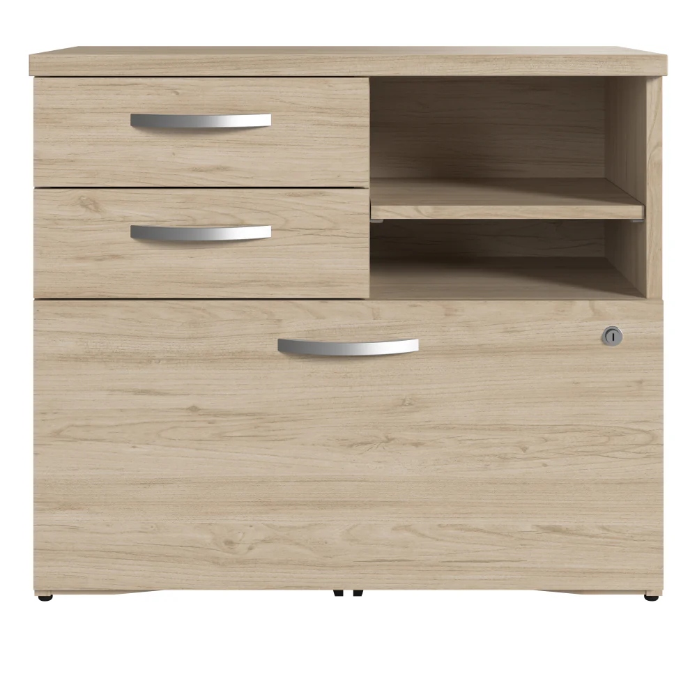 The Bush Business Furniture Studio C Office Storage Cabinet with Drawers and Shelves offers a stylish, long-lasting workplace organization solution for today's professionals. Keep important documents, office supplies, work-in-progress, and equipment in order so you can access the materials you need quickly and easily. A file drawer opens on smooth full-extension ball bearing slides for an effortless reach to letter, legal and A4-size paperwork and can be locked to protect sensitive information. Two box drawers organize writing utensils, notepads and other supplies while the open shelves are ideal for frequently used items. The file storage cabinet's stable design and included wall attachment hardware make it a safe choice for use in virtually any home or professional office environment. Find the perfect look for your space with a variety of traditional and contemporary finish options. This Lateral File Cabinet with Shelves has been meticulously tested to meet or exceed ANSI/BIFMA quality standards for safety, durability and performance and is backed by the Bush Business Furniture 10 Year Manufacturer's Warranty. See the full Studio C Collection for coordinating items to enhance your workspace as needed, including Desks, Chairs, Bookcases and Storage Cabinets (coordinating items sold separately). American made with U.S. and imported parts.