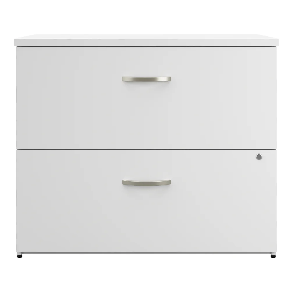 Bush Business Furniture's Office in an Hour Collection is an ideal solution for converting empty space into a practical and productive work environment. Designed with convenience in mind, this 2 Drawer Lateral File Cabinet arrives fully assembled so you can enjoy an organized workspace without the hassle and stress of installation. The filing cabinet's two spacious drawers open on smooth full-extension ball bearing slides for an effortless reach to letter, legal, and A4-size paperwork. A single lock secures both drawers to protect documents with sensitive information as well as personal items you want kept tucked away. The surface of the 2 Drawer File Cabinet can serve as a small printer stand or laptop charging station and can also be used to brighten up the room with plants, pictures, and decorations. Brushed Nickel hardware complements an attractive finish for a professional appearance that suits any office environment. This locking file cabinet has been meticulously tested to meet or exceed ANSI/BIFMA quality standards for safety and performance and is backed by the Bush Business Furniture 10 Year Manufacturer's Warranty. See the full collection for coordinating Office in an Hour products to build a workspace that's ready when you are.