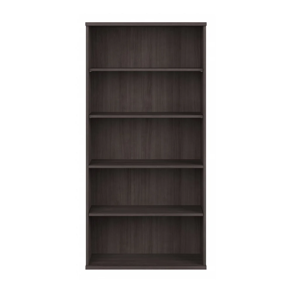 The Bush Business Furniture Studio C 5 Shelf Bookcase looks great, works hard and adjusts to fit the needs of your office. Designed with 2 fixed and 3 adjustable shelves, the Bookcase holds your books and reference materials with room for your favorite decorative accents. Store a variety of items on the spacious and durable shelves, designed to hold up to 50 lbs each. A thermally fused laminate finish fends off scratches, stains and dents throughout years of everyday use. Add the Bookcase Door Kit (sold separately) to conceal the lower shelves for an organized look. The 5 Shelf Bookcase features a classic design but comes in a contemporary White or Storm Gray finish to fit perfectly in modern workspaces. Purchase a set of Bookcases to build a complete storage wall that organizes your office and expresses your style. This contemporary 5 Shelf Bookcase comes with a 10 Year Warranty and meets ANSI/BIFMA quality test standards. See the full collection for coordinating items available to make your office your own with Studio C. American made with U.S. and imported parts.