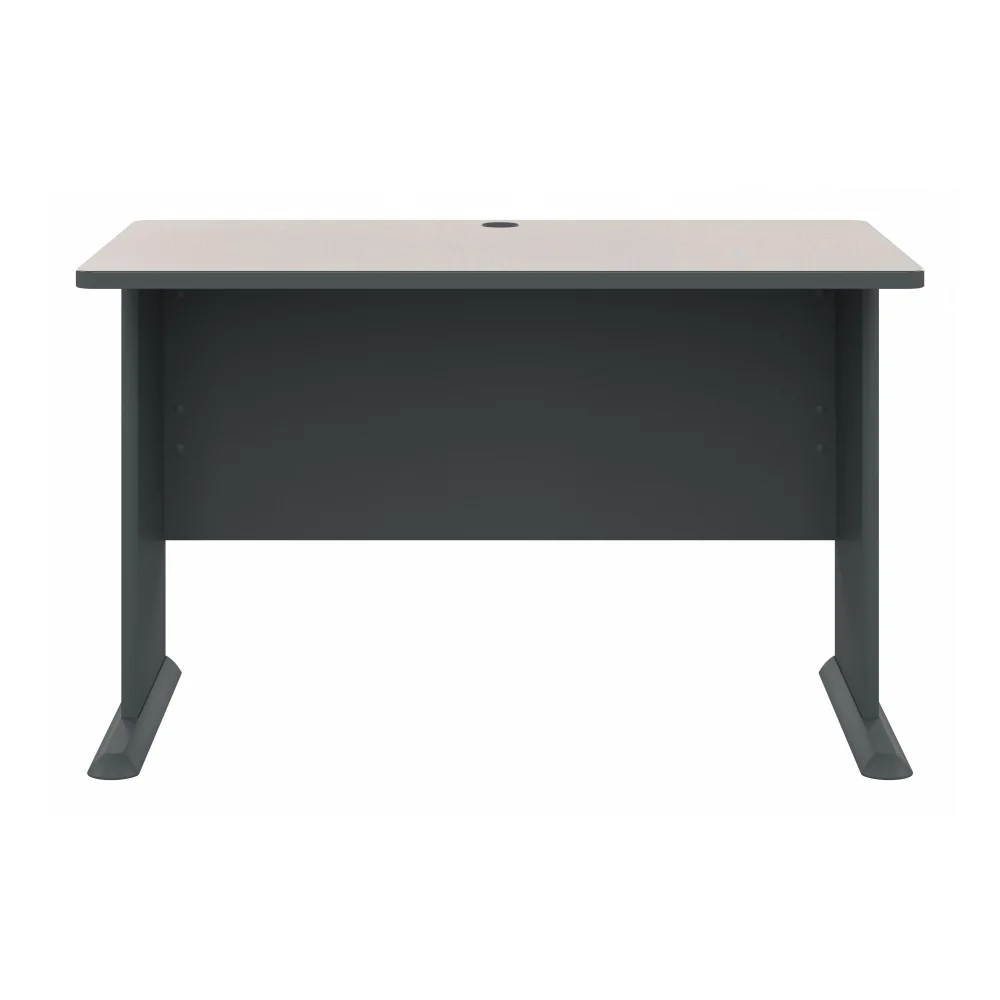 The Bush Business Furniture Series A 48W Desk provides lasting comfort and durability in a compact package. Perfect for a small office or as part of a larger workspace, the commercial-grade Desk features an open C-Leg design to maximize legroom. Thick end panels resist damage, while a thermally fused laminate surface fends off scratches and stains for a long-lasting professional appearance. Wire management grommets organize and secure computer cables to keep them out of your way. Sturdy Desk feet include encapsulated steel armature and adjustable levelers for use on all types of flooring. The Office Desk accepts a coordinating Hutch, Mobile File Cabinets, Keyboard Tray or Pencil Drawer (all sold separately). Series A completes your multi-person workspace, classroom, home office or anywhere in between with a variety of configuration options. Featuring multiple two-tone finishes and contemporary styling, this commercial office furniture adapts to your surroundings. Customize any environment with a full line of affordable products, all backed by a 10 Year Warranty. Series A withstands the rigors of a 40-plus hour week and meets ANSI/BIFMA quality test standards. American made with U.S. and imported parts.